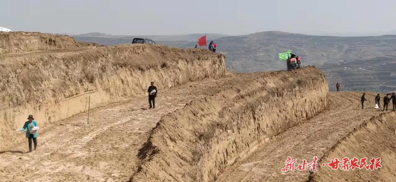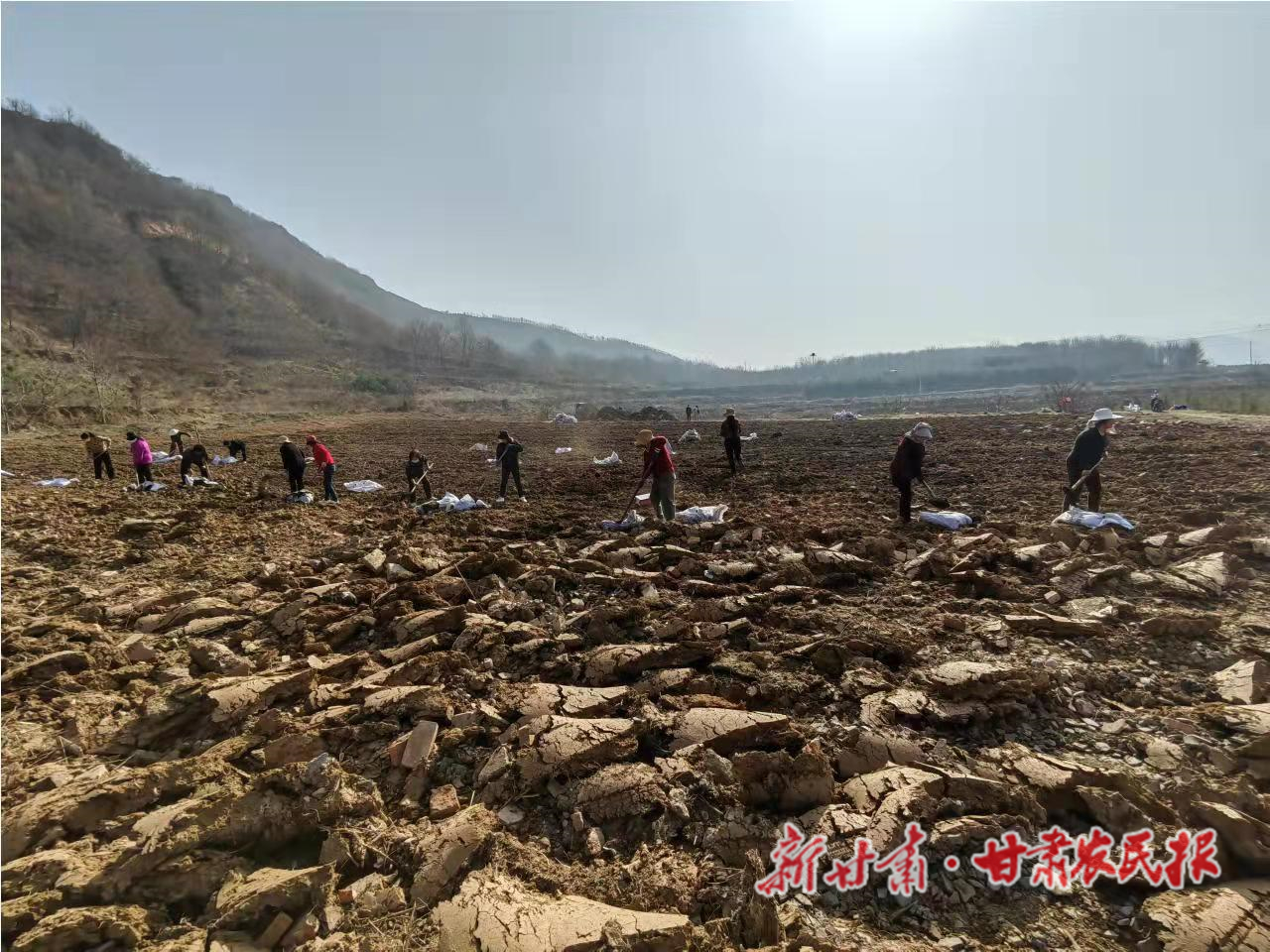 麦积区甘泉镇廖家村附近的务工人员正在合作流转的撂荒地里施肥。王惠萍摄