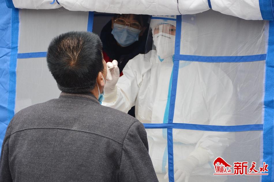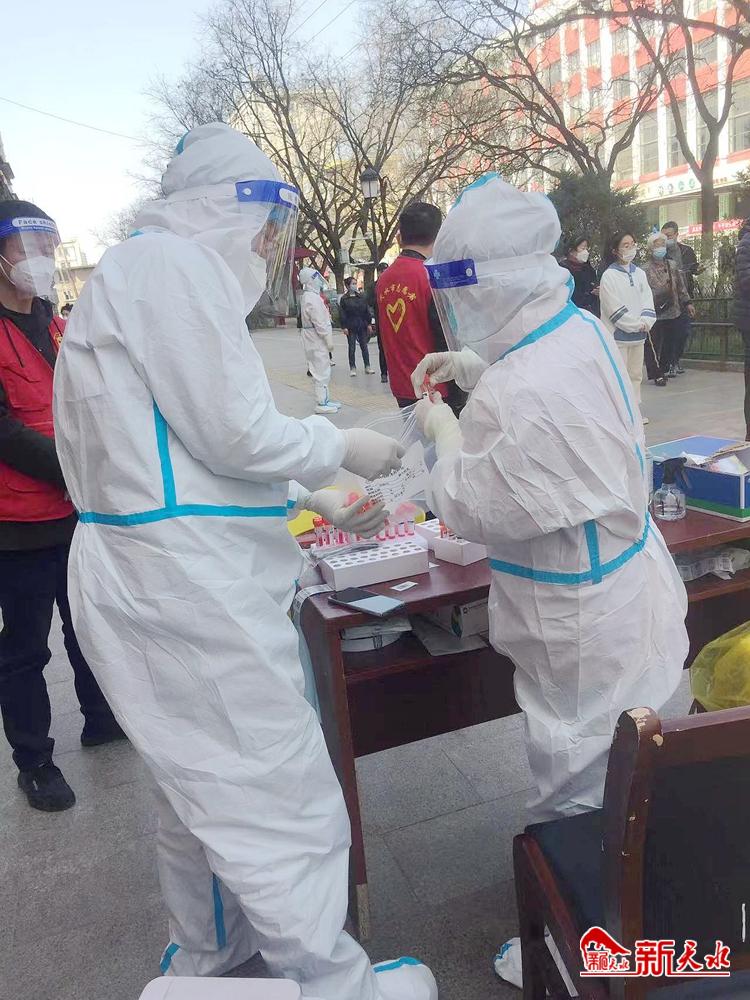 在秦州区兰天新华苑门前,市妇幼保健院的医护人员承担着仁和里社区采样点任务。蒋冰清和王雪梅是一组搭档,王雪梅负责采样群众的信息采集,蒋冰清负责核酸采样,两人分工明确,配合十分默契。
