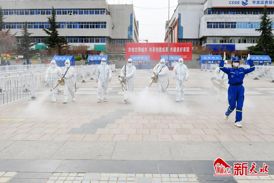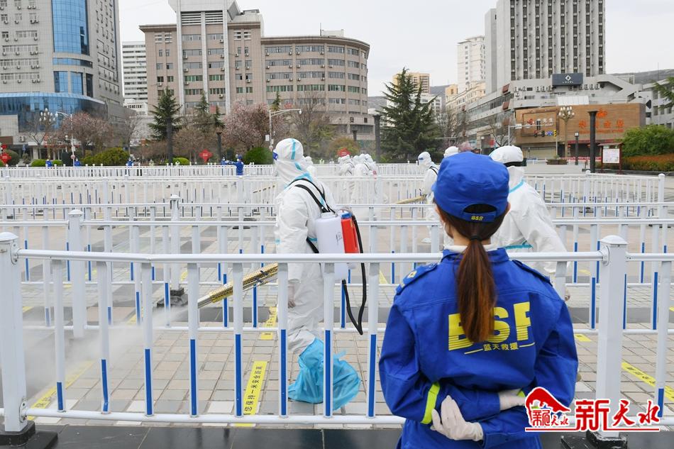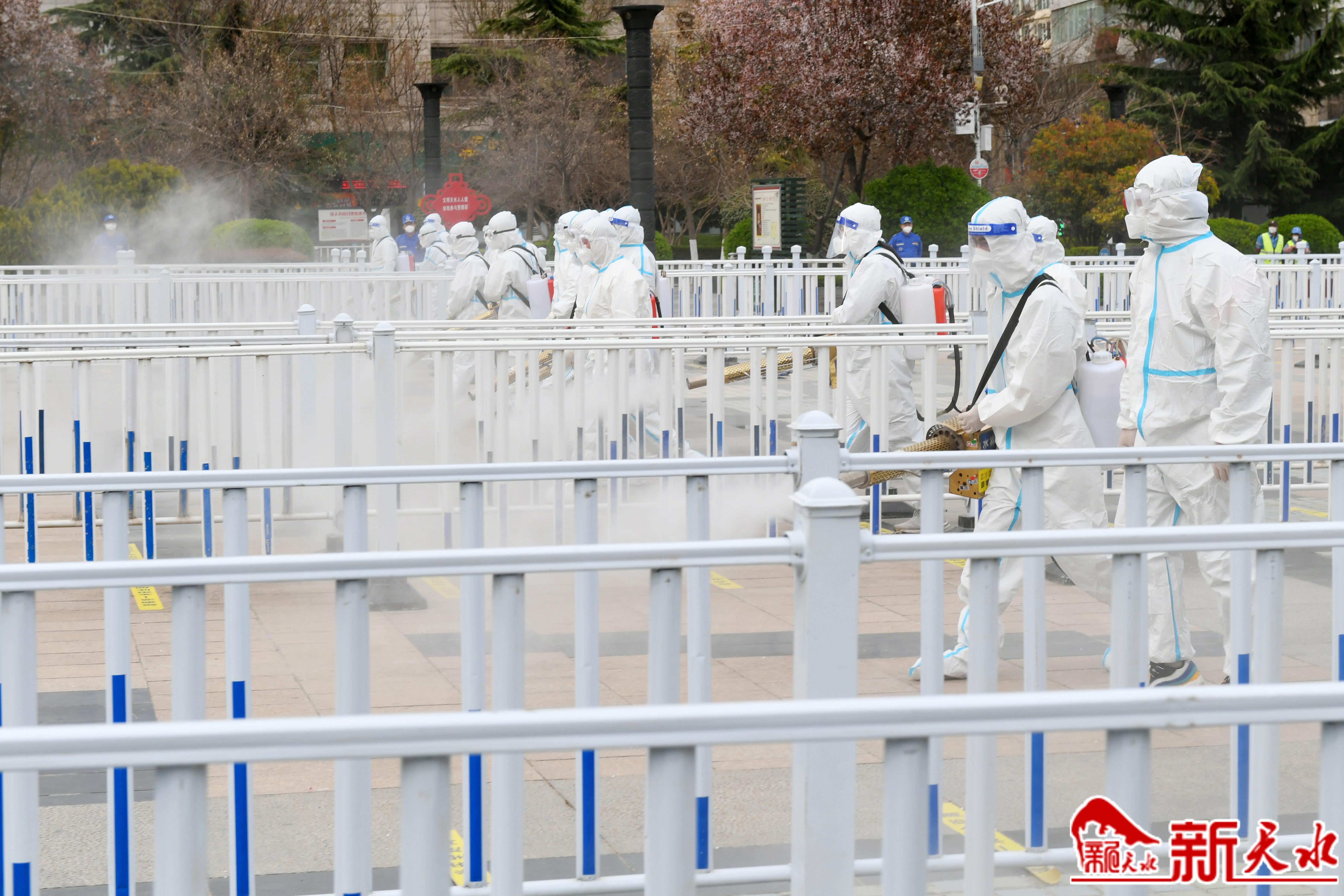 3月26日下午,在天水市龙城广场,伴随着“隆隆”的轰鸣声,弥雾机喷出阵阵白雾。天水蓝天救援队的十几名志愿者身穿防护服,头戴护目镜,佩戴口罩和橡胶手套,手持30多斤重的弥雾机,身背10多斤的箱,三人一组或六人一组,采用地毯式喷洒消毒的方式,对龙城广场核酸检测采样点进行全面细致地消杀。