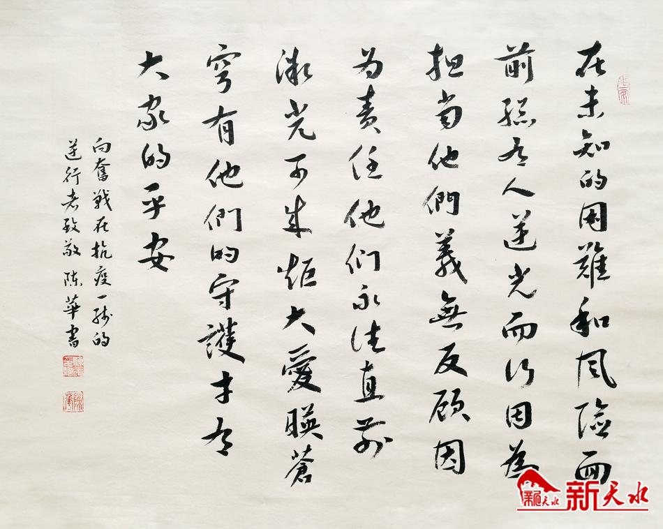 用歌声凝聚力量,坚定抗击疫情的必胜信心;以丹青描绘感动,勾画防控疫情一线工作者的身影……本轮新冠肺炎疫情发生后,天水市文化和旅游局组织全系统文艺工作者积极投身文艺抗疫作品创作,广大文艺工作者满怀深情与担当,创作推出戏曲、诗歌、散文、绘画、书法、短视频等多种形式的文艺作品,以自己的方式,为抗疫贡献一份力量。