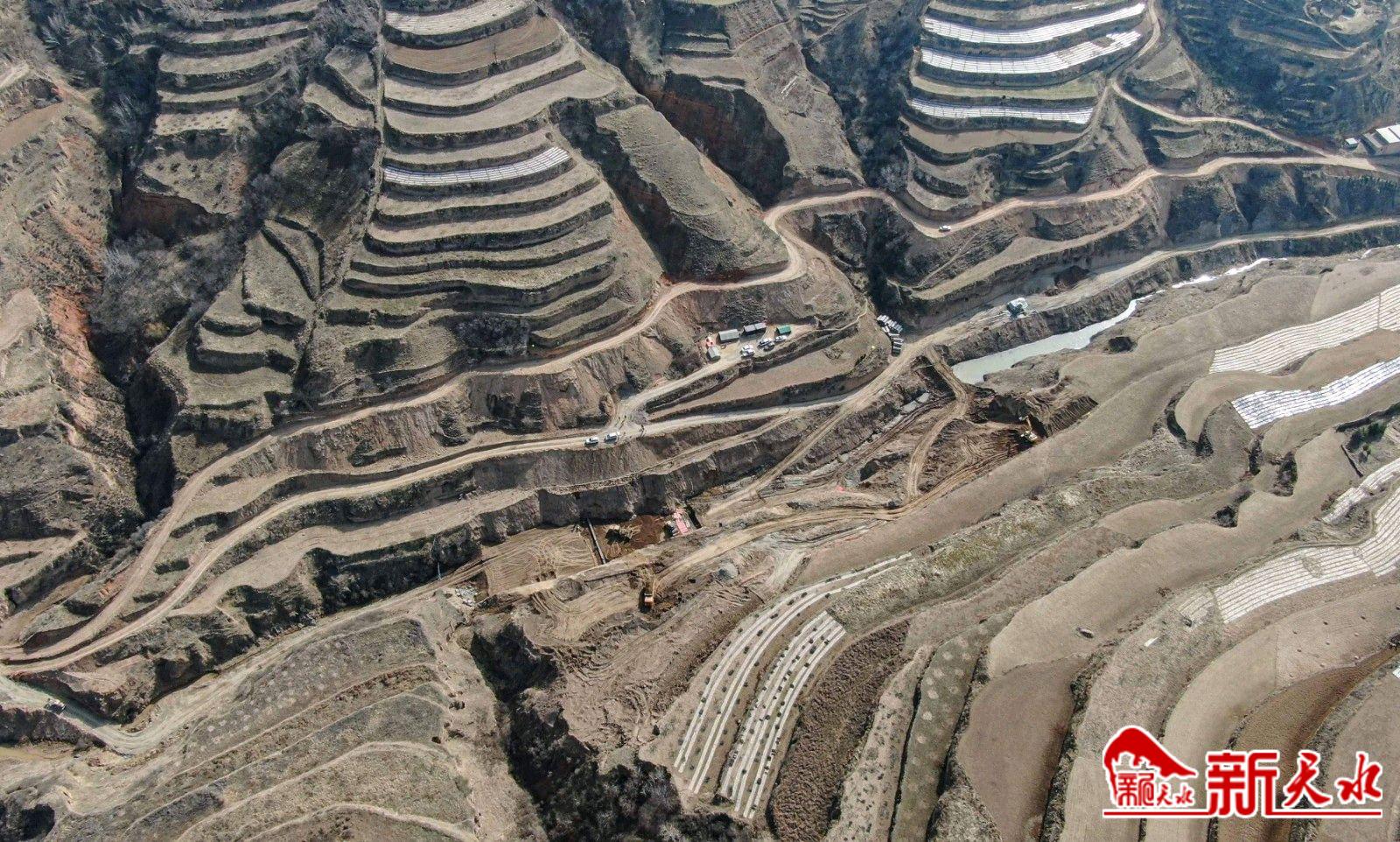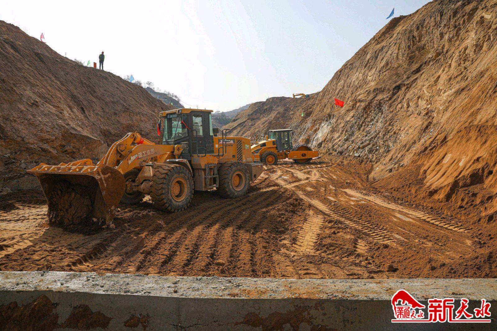 新天水讯 日前,记者在王铺镇周岔村淤地坝工程项目建设现场看到,大型机械正在平整河道,运输车辆来回穿梭于山峁沟壑间,一切显得紧张而有序。