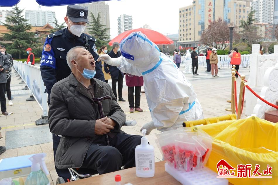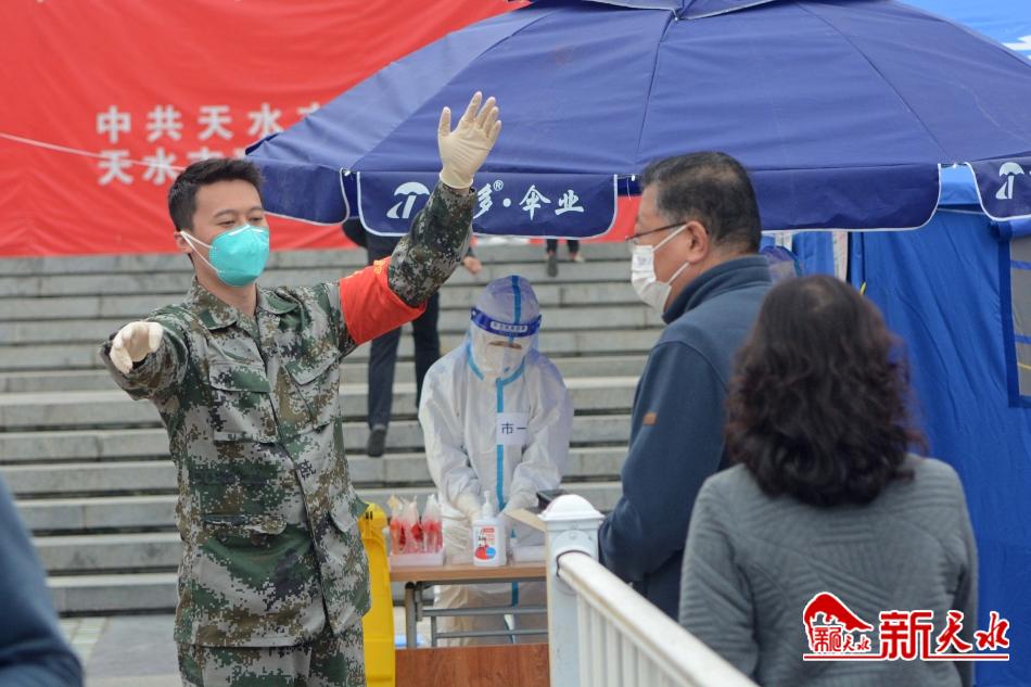 3月29日,秦州区居民在各采样点接受核酸检测。居民按照工作人员的指引有序排队,主动出示“健康码”,全程佩戴口罩,保持1米间隔距离,不扎堆、不聚集,做到“应检尽检”,确保不落一户、不漏一人。当天,秦州区西关、大城、中城、东关、石马坪、天水郡、七里墩7个街道及玉泉镇开展第六轮区域核酸检测。