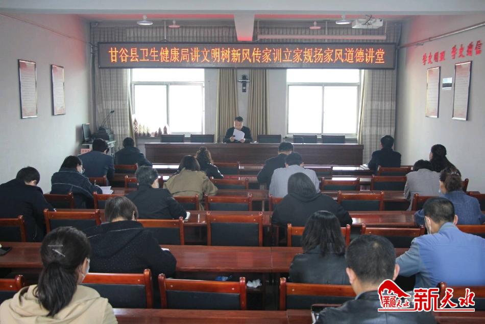 新天水讯【通讯员 王峡弟】 3月28日,甘谷县卫健局举行“讲文明、树新风、传家训、立家规、扬家风”主题道德讲堂活动,局机关全体干部职工一起聆听道德故事,品悟道德力量,接受道德洗礼。