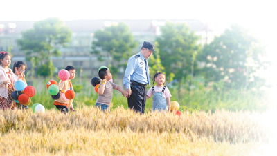 在江苏省射阳县海河镇跃华村,民警陈云峰带着村里的孩子们在田间玩耍,并向他们讲解安全知识。