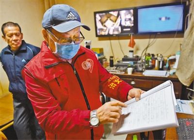 为改善社区治安状况,陕西省西安市莲湖区桃园路街道劳动一坊社区成立了一支由党员和群众组成的“萤火虫”志愿巡逻队,协助社区开展治安巡逻、纠纷调解等工作。图为巡逻队队员在查看社区出入人员的登记信息。