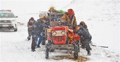四川省阿坝藏族羌族自治州若尔盖县人民法院工作人员在下乡调研途中帮助群众推车。