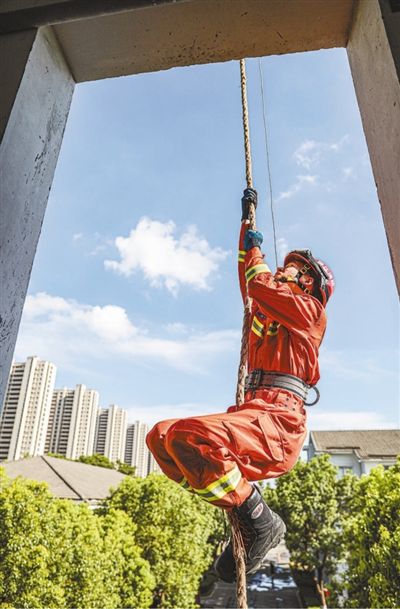 在浙江省湖州市南浔区消防救援大队训练场上,消防员正在紧张训练。
