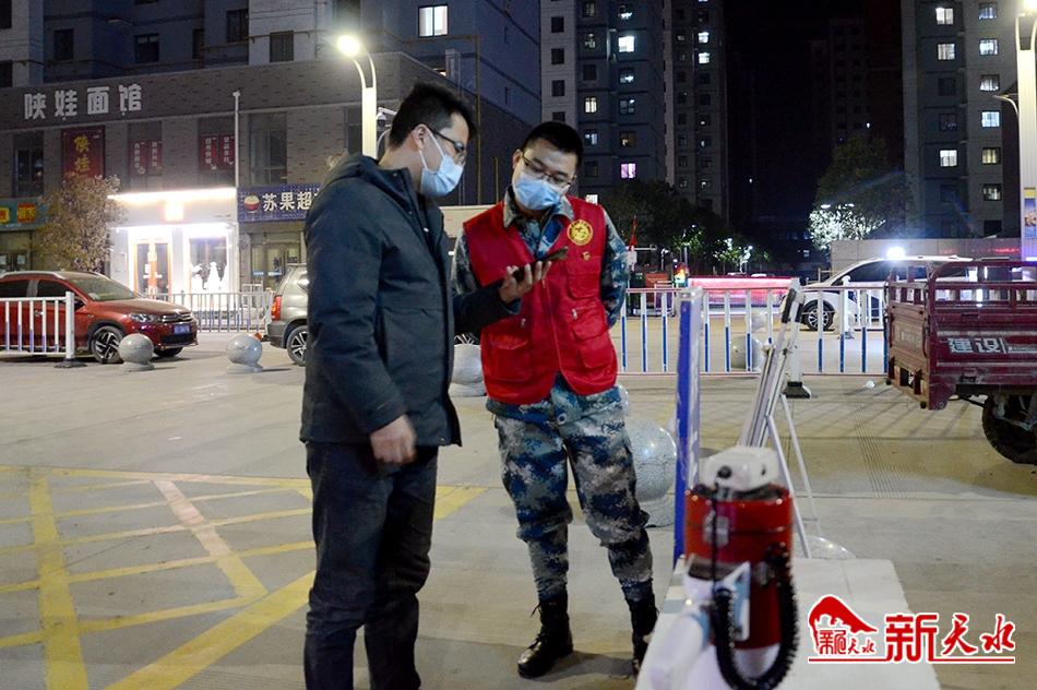 “同志,请出示您的健康码和出入证”,夜色微寒,依旧值守在秦州区七里墩街道和谐路社区门口的赵斌认真核查着进出小区的人员、车辆,一身蓝色迷彩军装,外加显眼的“志愿红”马甲,让空旷冷清的街道多了一丝温暖和安心。