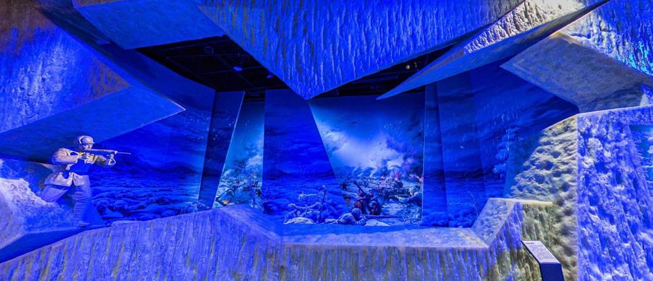 在抗美援朝战争历程全景沙盘中,实景沙盘+LED光点演示全面展示抗美援朝战争进程,作战双方的进攻路线、战斗态势一目了然;在冰雪长津湖场景中,运用时空并序的方法设计背景油画和近景,以裂开的冰块为外形,通过声、光、电展示志愿军战士在冰雪中鏖战的悲壮场面;在家喻户晓的奇袭白虎团场景中,选取了幻影成像+LED的手段来展示两个不同的空间,在形式上令人耳目一新。