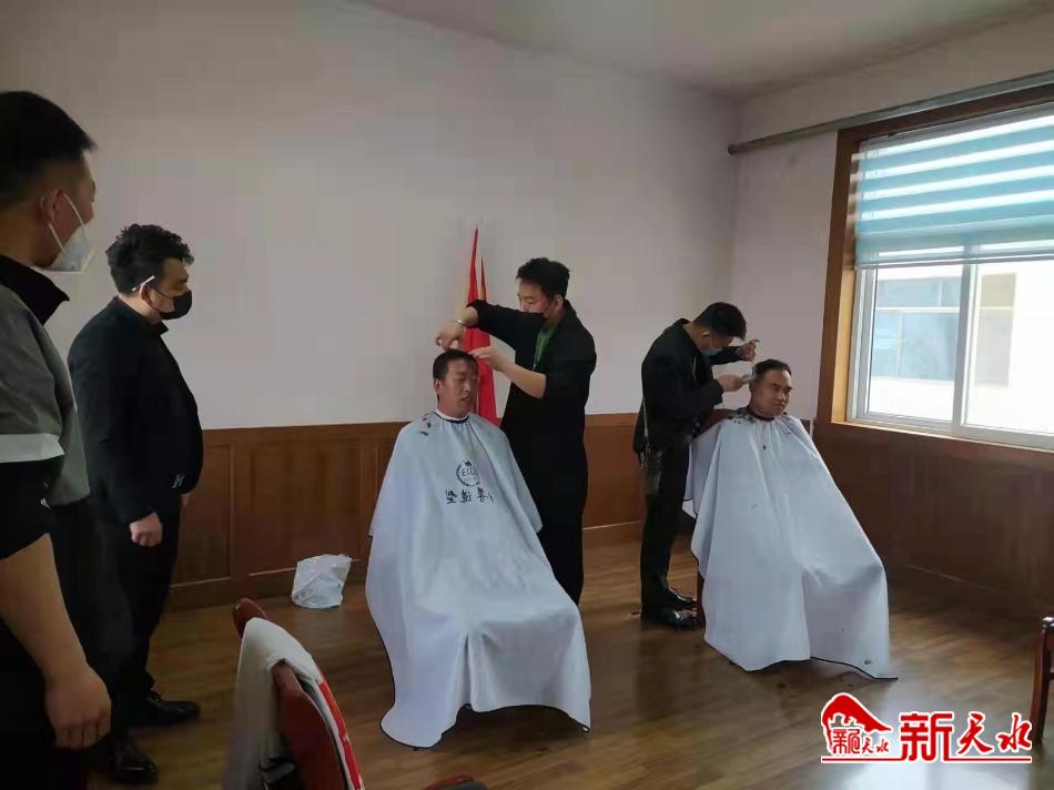 新天水讯 4月3日,秦州区“金尊造型连锁理发店”给天水市秦州区城市管理综合执法局七里墩中队抗疫一线人员提供贴心便利的志愿服务。