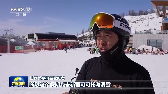 山西太原滑雪爱好者:在我们刚结束冬奥会以后呢,3亿人上冰雪的号召在延续,所以这个假期我来新疆可可托海滑雪。虽然现在已经到了春天了,好多地方都开始穿短袖了,但是在我们中国的西北部,新疆阿勒泰地区可可托海,目前的雪质非常好,我们很多朋友都来这边滑雪。