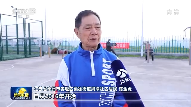 江苏省泰州市姜堰区梁徐街道周埭社区居民 陈金虎:过去我们想要锻炼,没有地方去。自从2016年开始,村里已经有了锻炼的设施,现在我们在家门口锻炼,非常方便,已经成为我们的习惯,变成了我们生活的一部分。