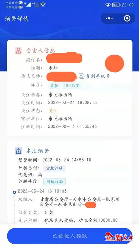 新天水讯 3月24日,张家川县公安局东关派出所接到天水金钟罩小程序辖区电信诈骗预警信息,随即值班民警立即与当事人取得联系,当事人称未上当受骗。恰巧这时社区民警正好在当事人所在的村庄入户宣传电信诈骗防范相关知识,于是值班民警将此信息反馈给进村入户的社区民警,社区民警立即赶赴当事人家中对其进行电信诈骗防范知识的宣传讲解。