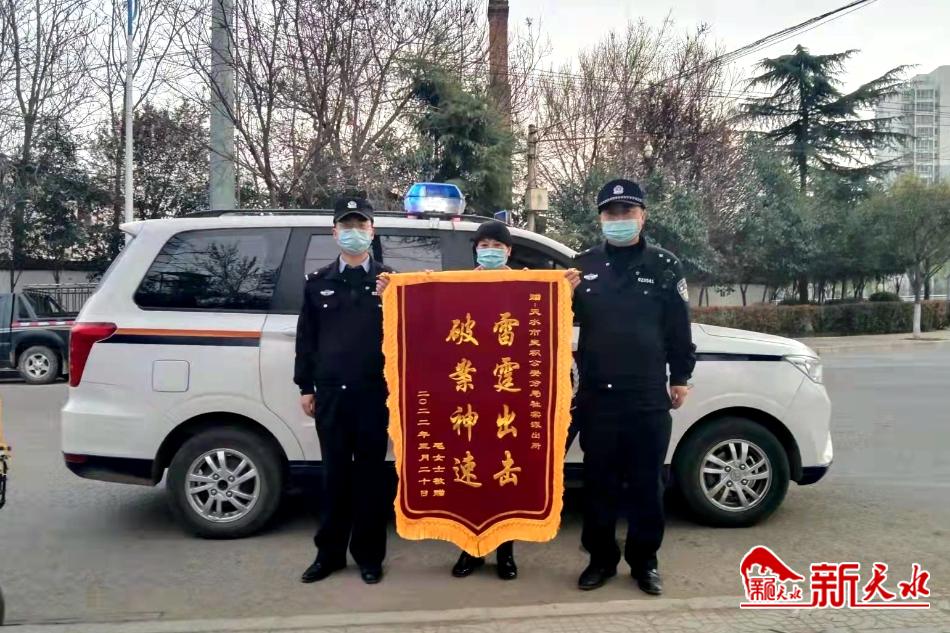 新天水讯【记者王晓华】4月5日,麦积区市民毛女士将一面写有“雷霆出击 破案神速”的锦旗送到天水市公安局麦积分局社棠派出所巡逻点民警手中,对民警的热情服务表示感谢。