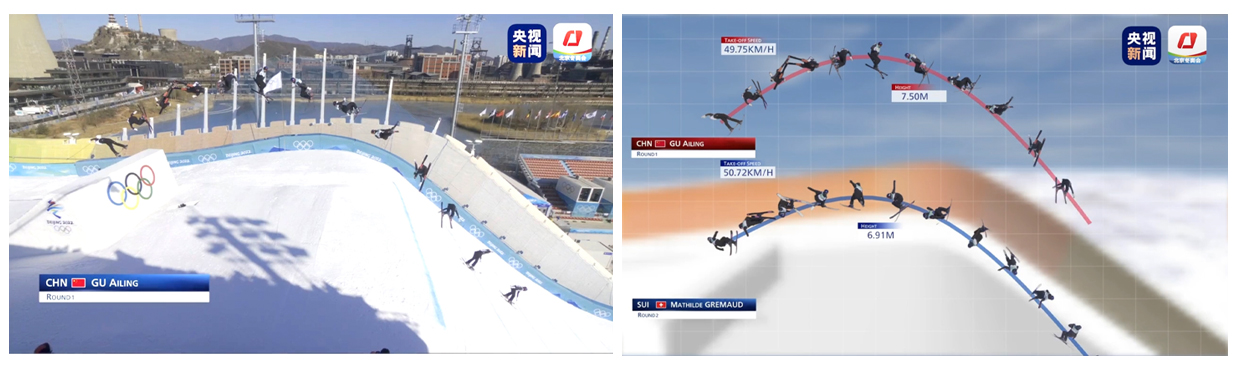 时间切片升级可视化呈现效果。总台自主研发的超高清AI时间切片系统,只需15秒就能逐帧抓取运动员从起跳到落地之间的空中姿态,将运动员的精彩表现在最短时间内真切地呈现给观众。该系统基于4K以上超高分辨率视频信号,使用人工智能深度学习算法,结合视觉暂留技术、图形学、图像学及自动化控制技术构成AI图像处理系统,通过数据分析和二次包装,实现逐帧呈现和提炼放大。