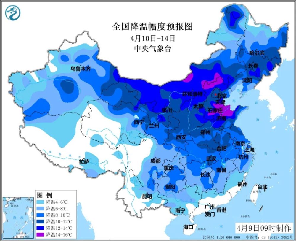 中央气象台预计,4月10日至14日,一股较强冷空气将自西向东影响我国大部地区,内蒙古、山西、河北、山东、河南、吉林等地部分地区降温幅度可达12~16℃,局地16℃以上,白天最高气温降幅明显;北方大部地区降温时还将伴有大风天气,西北部分地区将出现沙尘;11日夜间至12日,河北、河南、山东及南方大部地区有雷暴,部分地区有强对流天气。