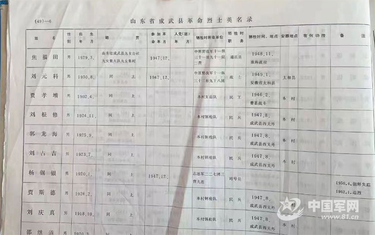 文章中注明“焦像田”烈士的原籍是“成武县九女荣村”,成武县退役军人事务局经过摸排,发现现在的九女集镇并没有“荣村”这一地名。是否是解放前的地名?还是解放后行政区划更改了?查阅成武县烈士英名录、史志和军事志等资料的同志,翻遍了有关档案也没有见到这个烈士名字。他们与淮海战役烈士陵园联系,进一步了解烈士信息,并通过走访老兵,在县有关媒体转发寻亲信息等方式,开展了社会化寻找。一天下来,没有任何线索。