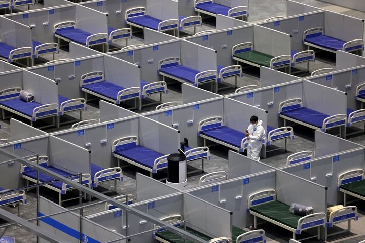 4月8日,在国家会展中心(上海)3号馆方舱医院,工作人员在调试服务机器人。新华社记者 金立旺 摄
