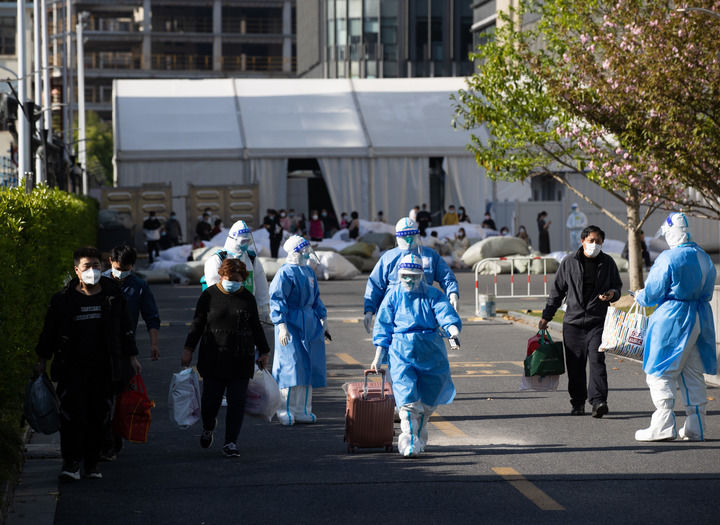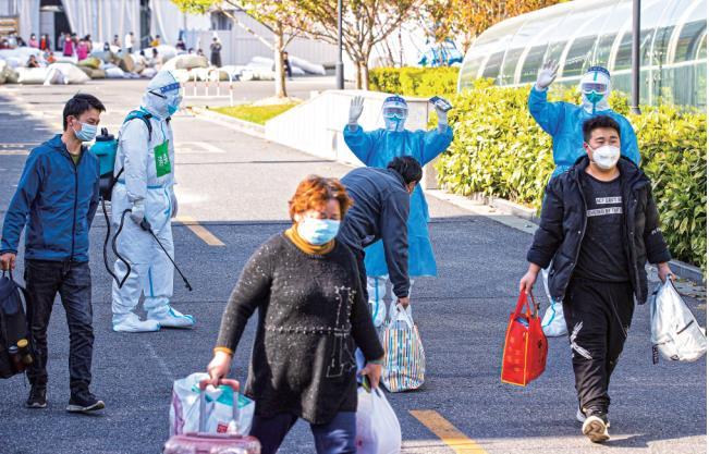 4月9日,在上海跨采中心方舱医院,第一批完成出院手续的四名康复者走出医院。新华社记者 金立旺 摄