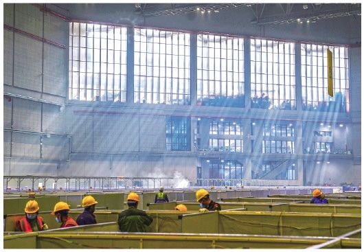 4月7日,工人在国家会展中心(上海)内作业。新华社记者丁汀摄