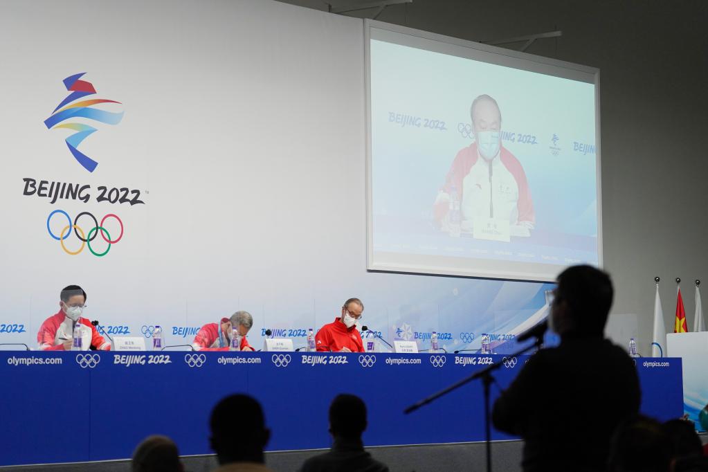 2月12日,北京冬奥组委疫情防控办公室副主任黄春(右上)在新闻发布会上通过视频连线方式回答记者提问。新华社记者鞠焕宗摄