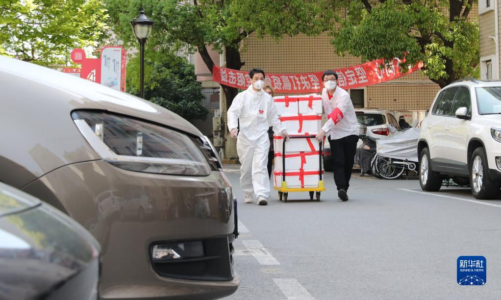 4月11日,上海市闵行区七宝镇社区志愿者施忠良(左)与他的志愿者伙伴一起为居民派送生活物资。(新华社记者方喆 摄)