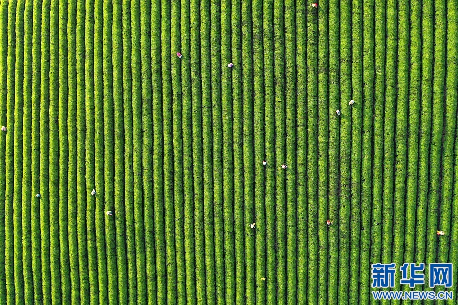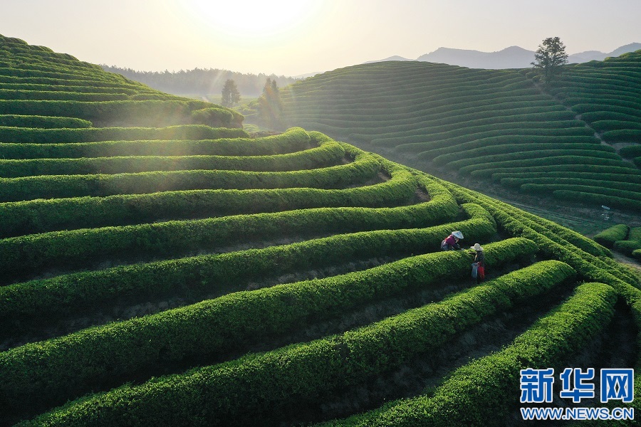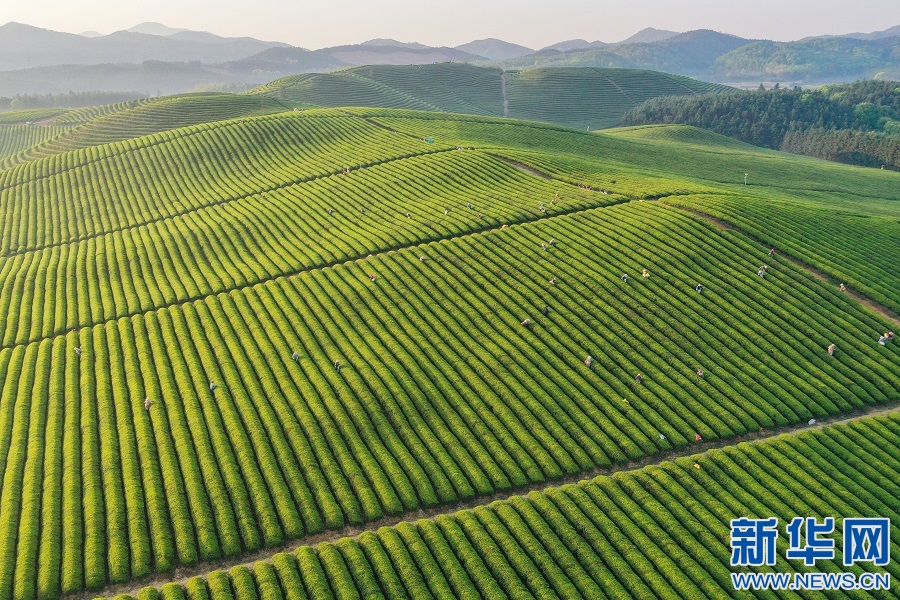 近日,在江西省宜春市上高县新界埠镇五星茶场,村民正在采摘新茶。茶场郁郁葱葱,生机勃勃。新华网发 陈旗海 摄