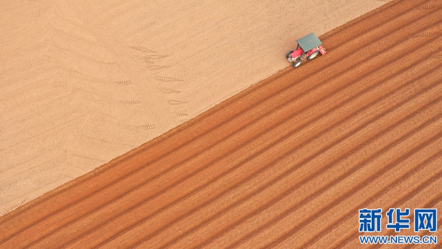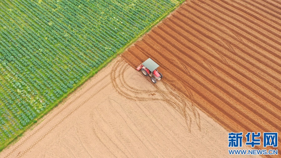 近日,在江西省吉安市泰和县塘洲镇洲头村,农民正在驾驶农机翻耕整地,准备种植蔬菜。田地翻耕前后,颜色形成对比。新华网发 邓和平 摄