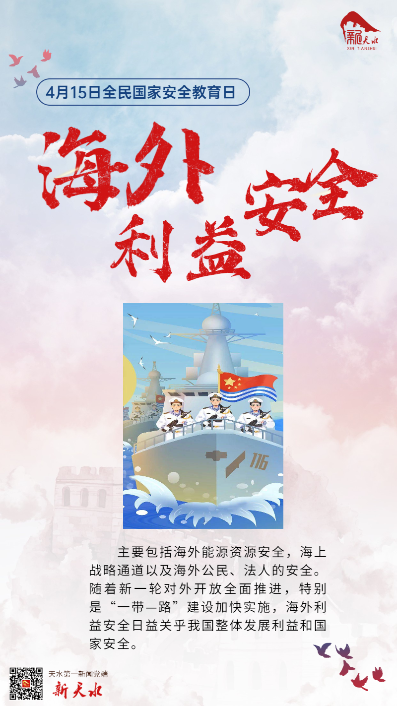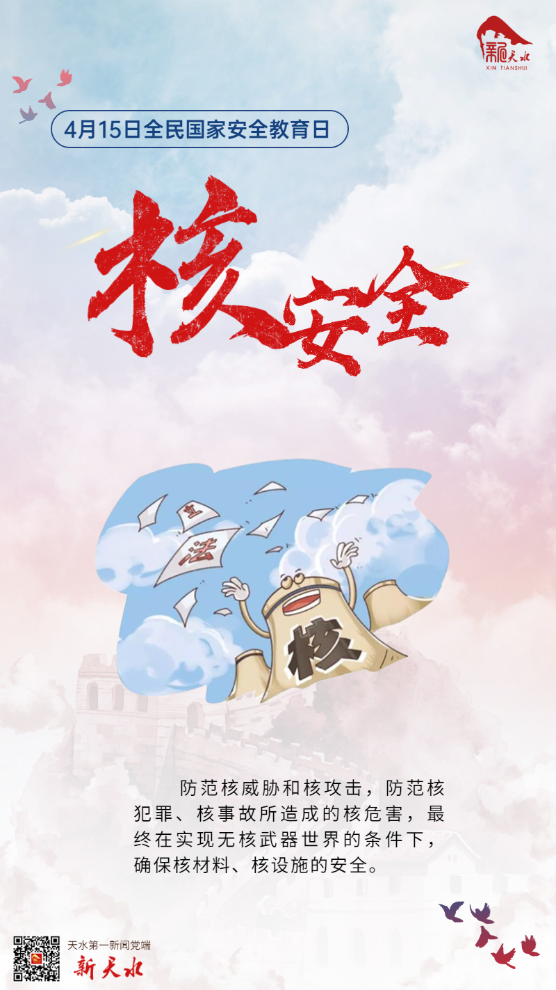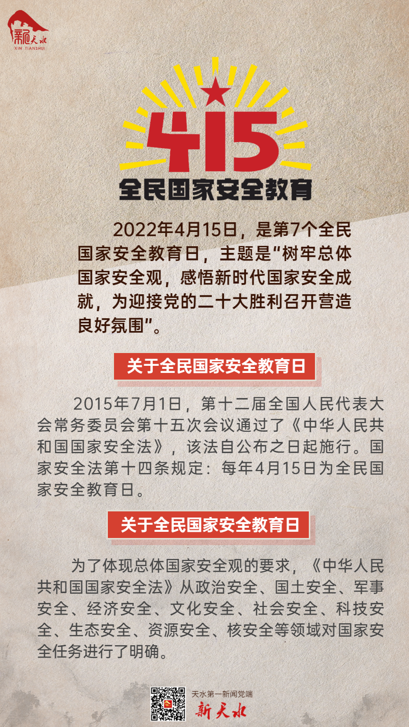 【编者按】国家安全与我们每个人息息相关,自觉关心、维护国家安全,是每个公民的义务。在第七个全民国家安全教育日到来之际,新天水网、新天水客户端开设“4·15全民国家安全教育日“专题,介绍《中华人民共和国国家安全法》《中华人民共和国核安全法》《中华人民共和国反恐怖主义法》《中华人民共和国反间谍法》《中华人民共和国网络安全法》《中华人民共和国国家情报法》《中华人民共和国国防法》《反分裂国家法》《中华人民共和国生物安全法》《中华人民共和国数据安全法》等国家安全相关法律。希望人人关心国家安全,人人都成为国家安全的坚定维护者。