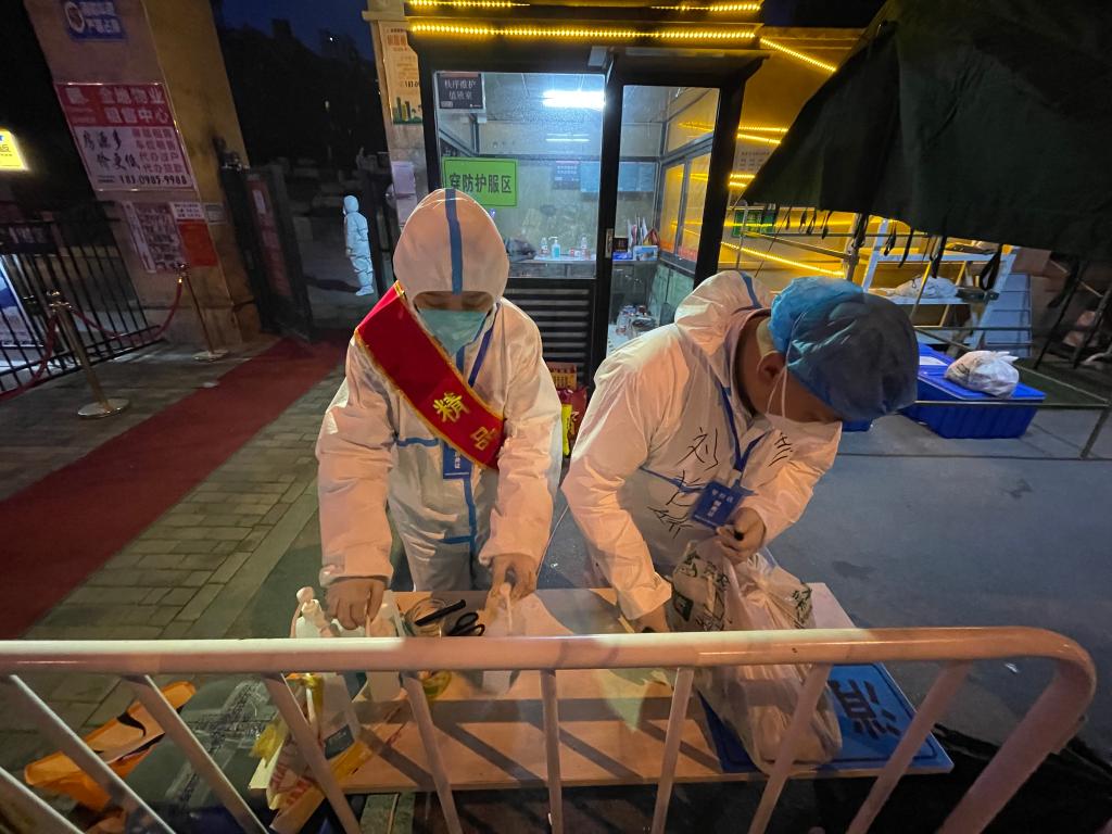 3月26日,志愿者在封控小区外整理消毒快递物品。(新华社记者李昂 摄)