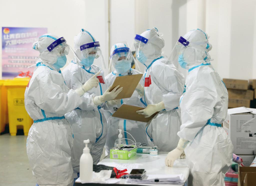 4月11日,世博展览中心方舱医院的医务人员讨论工作。新华社发(刘晓晶 摄)