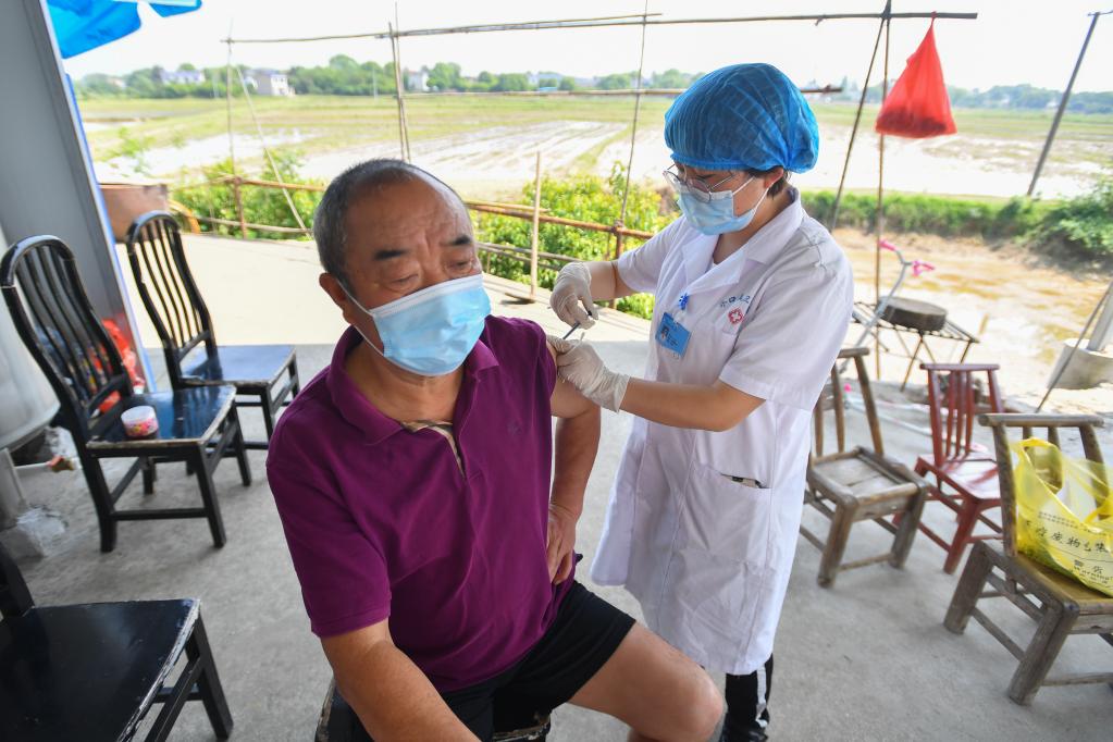 4月11日,在长沙市望城区乔口镇团头湖村,医护人员上门为腿脚不便的老年人接种新冠疫苗。(新华社记者陈泽国 摄)
