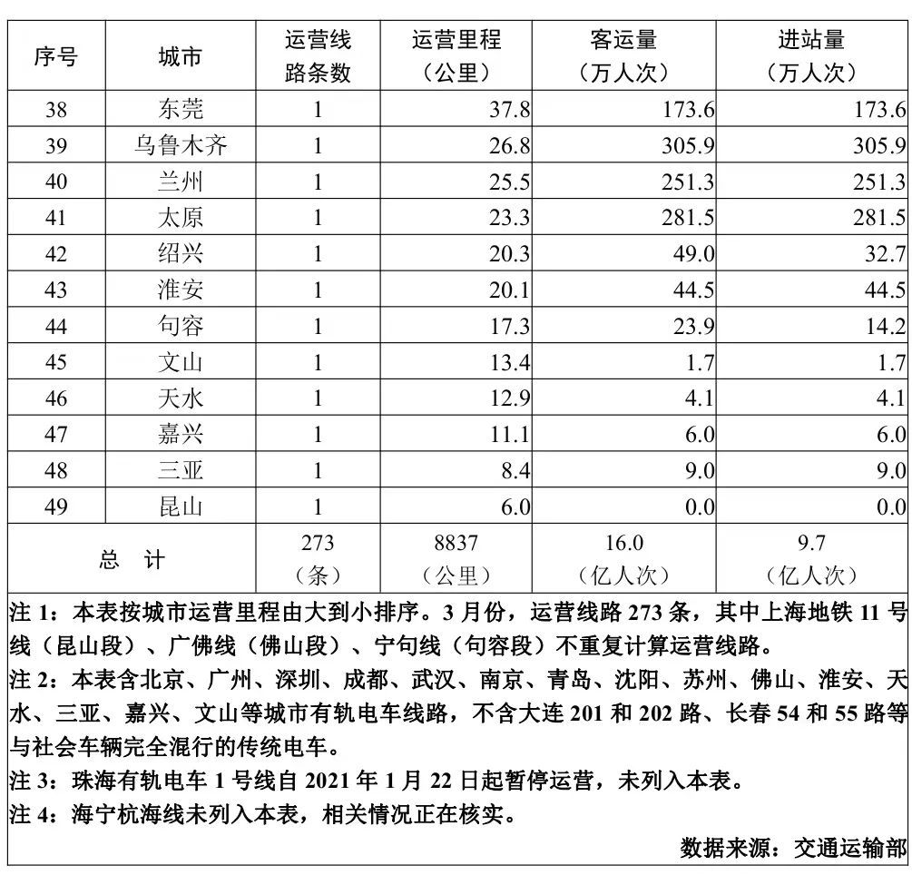 交通运输部:3月份51个城市共开通运营城市轨道交通线路273条