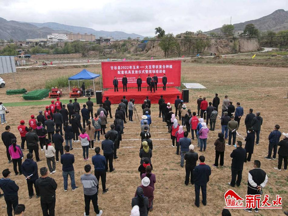 新天水讯【特约通讯员 王纯伟】为推进玉米大豆带状复合种植进度,提高机械化种植水平,4月14日,甘谷县在安远镇举行2022年玉米—大豆带状复合种植配套机具发放暨现场培训会。