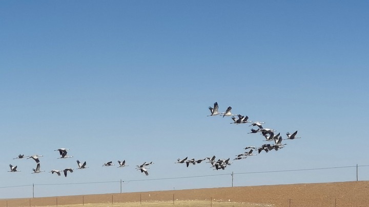 今年3月,青海果洛藏族自治州玛多县境内的三江源国家公园,蓑羽鹤在飞翔。新华社记者吕雪莉摄