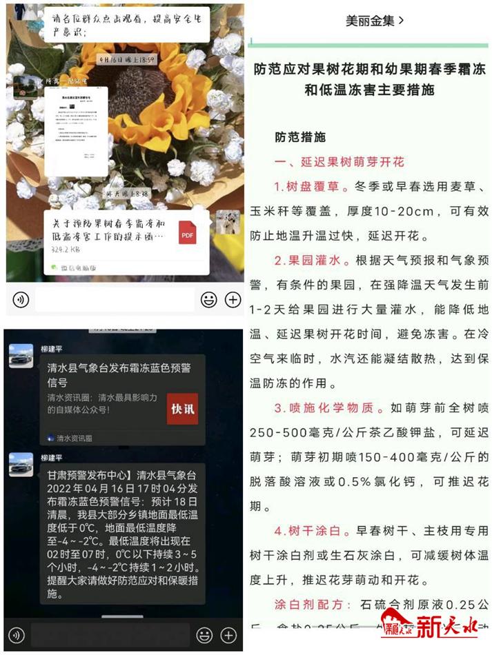 新天水讯 近日 ,清水县金集镇抓住最佳时段,采取得力措施,全力以赴组织群众科学有效应对近期低温霜冻天气,将低温霜冻造成的损失降到最低,为全镇果业发展保驾护航。