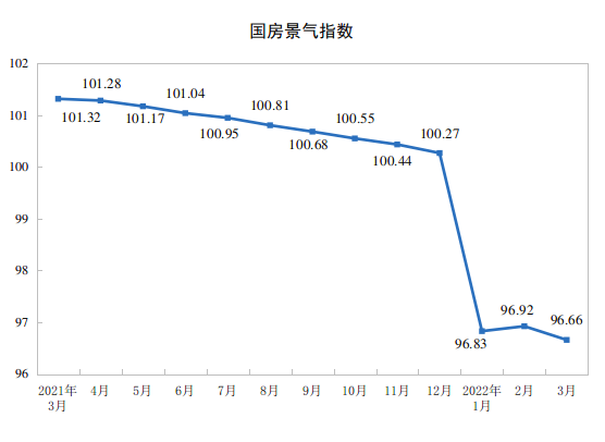 3月份,房地产开发景气指数(简称“国房景气指数”)为96.66。