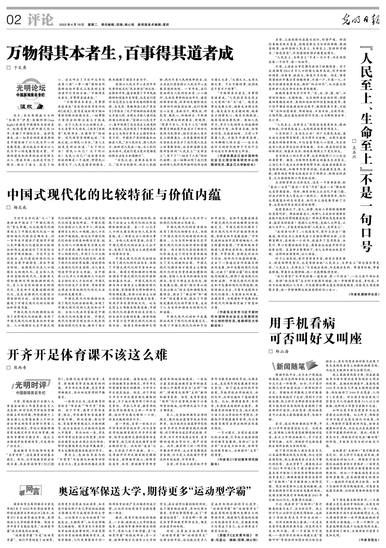 对于上海来说,医疗资源更丰富,动员力量更强大,制度保障更有力,也更有理由把“人民至上、生命至上”理念落实得更好。“人民至上、生命至上”不是喊出来的,而是做出来的。带着责任做,带着感情做,带着专业精神做,就一定能够做得更好。