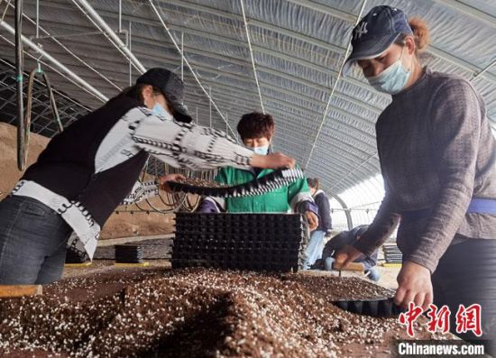 4月中旬,甘肃金昌市金川区一处温室大棚里,工作人员正在培育高原夏菜菜苗。 冯志军 摄