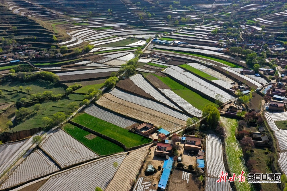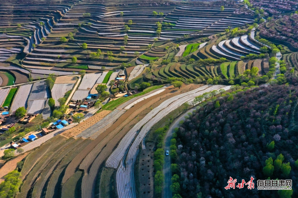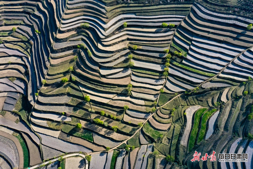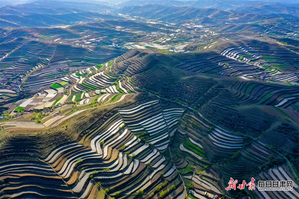 4月18日,白银市会宁县老君坡镇的山间梯田延绵数十公里,在大山深处若隐若现,大如曲池,小似新月,阡陌纵横若行云流水。村舍散落其间,农夫悠然劳作,静寂如世外桃源,一派诗意梦幻般的田园。