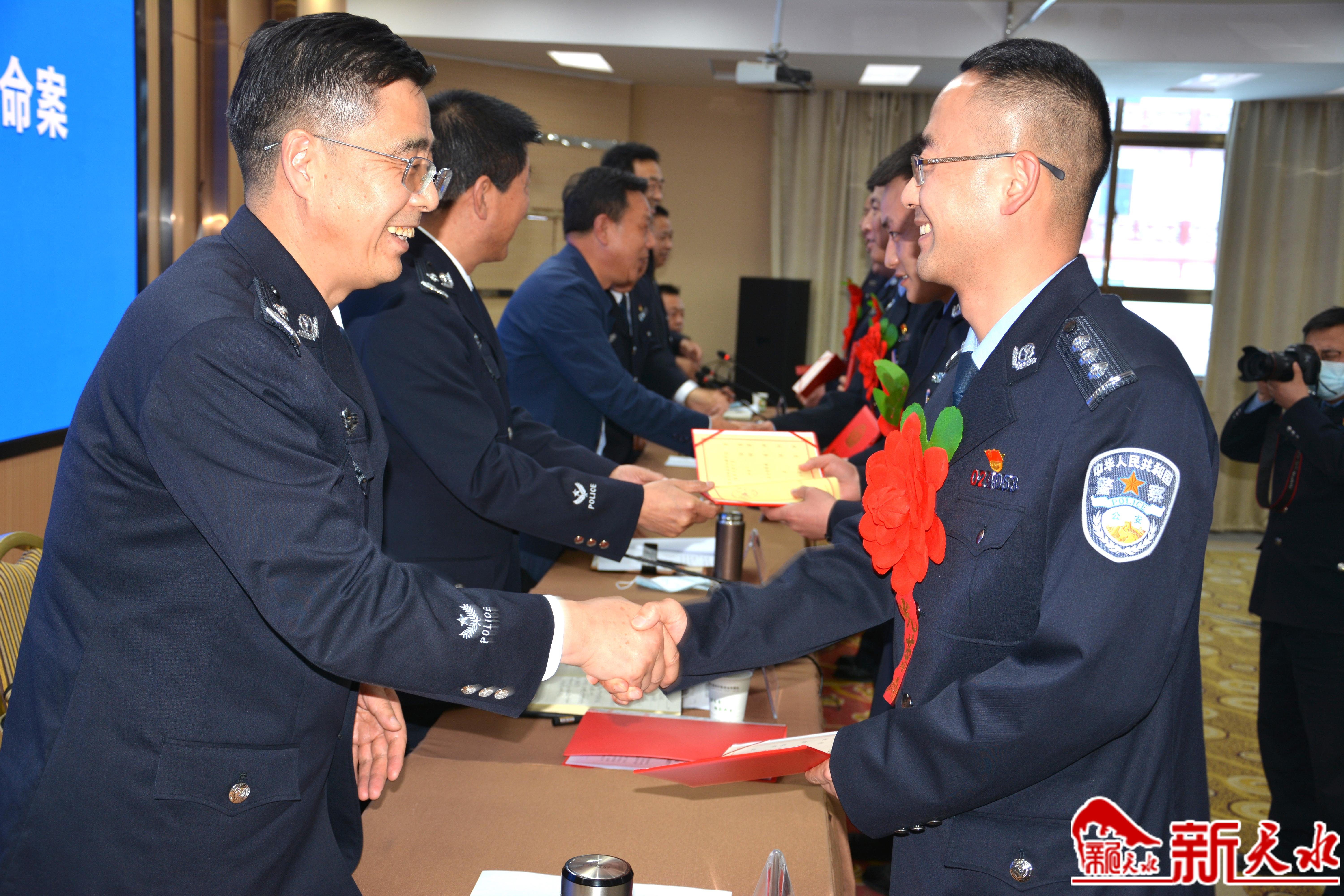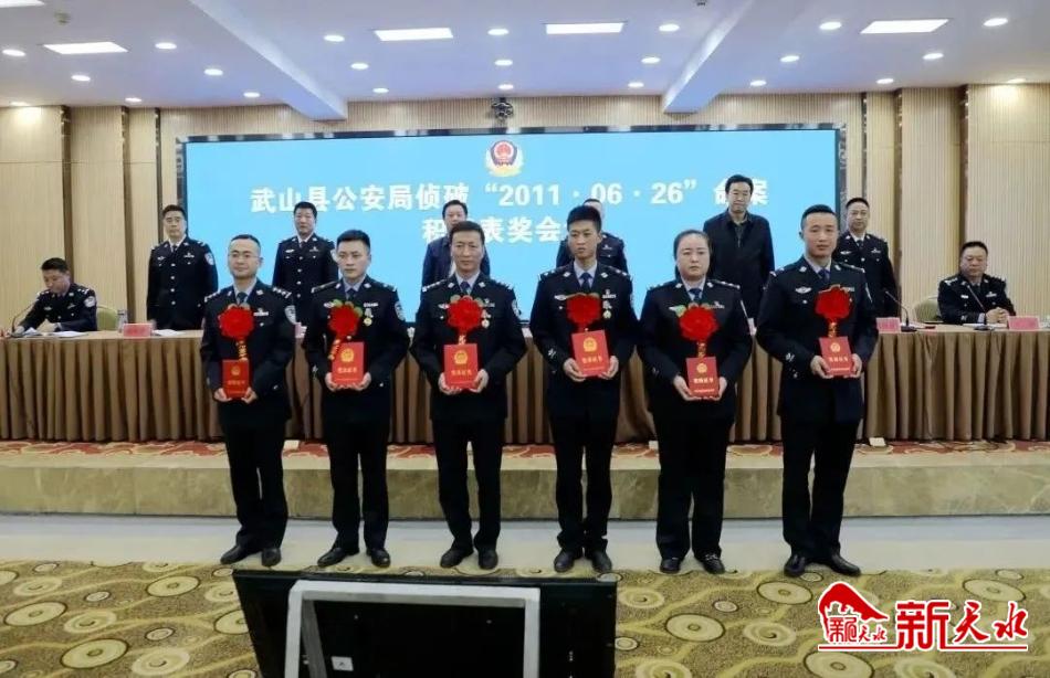 新天水讯【记者蔚军平】4月22日下午,天水市武山县公安局召开侦破“2011·06·26”命案积案表彰大会,会议宣读了有关嘉奖令、贺电,并为侦破“2011·06·26”命案积案成绩突出的民警颁奖。