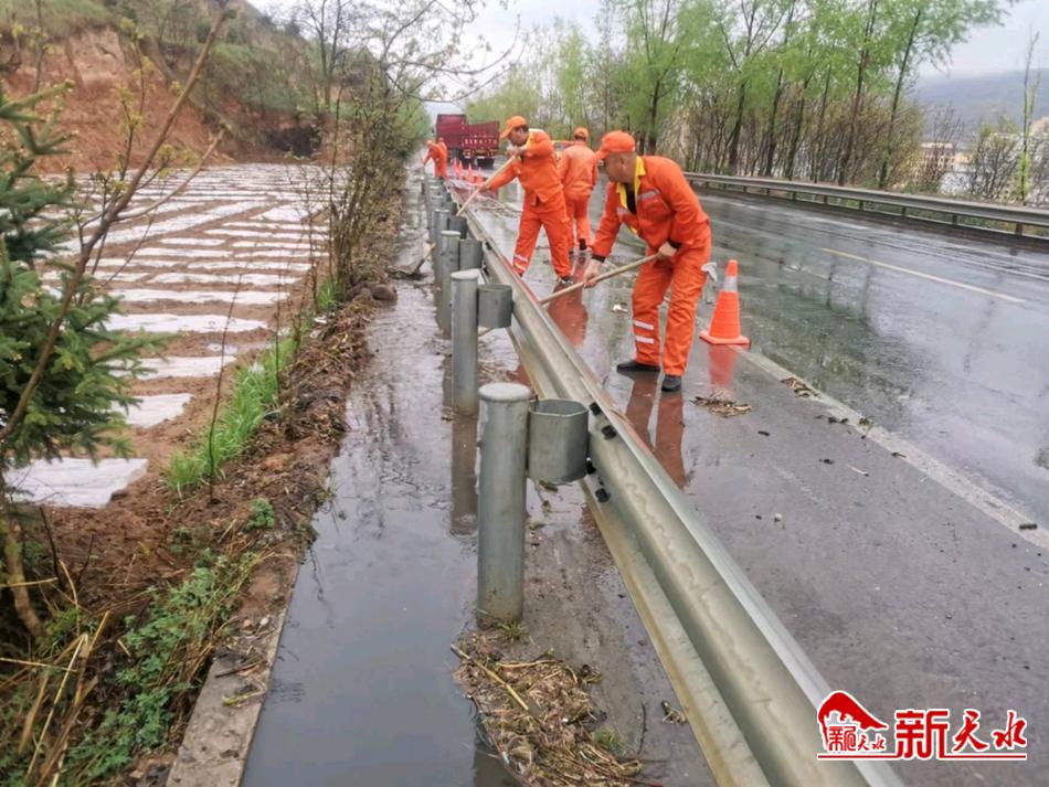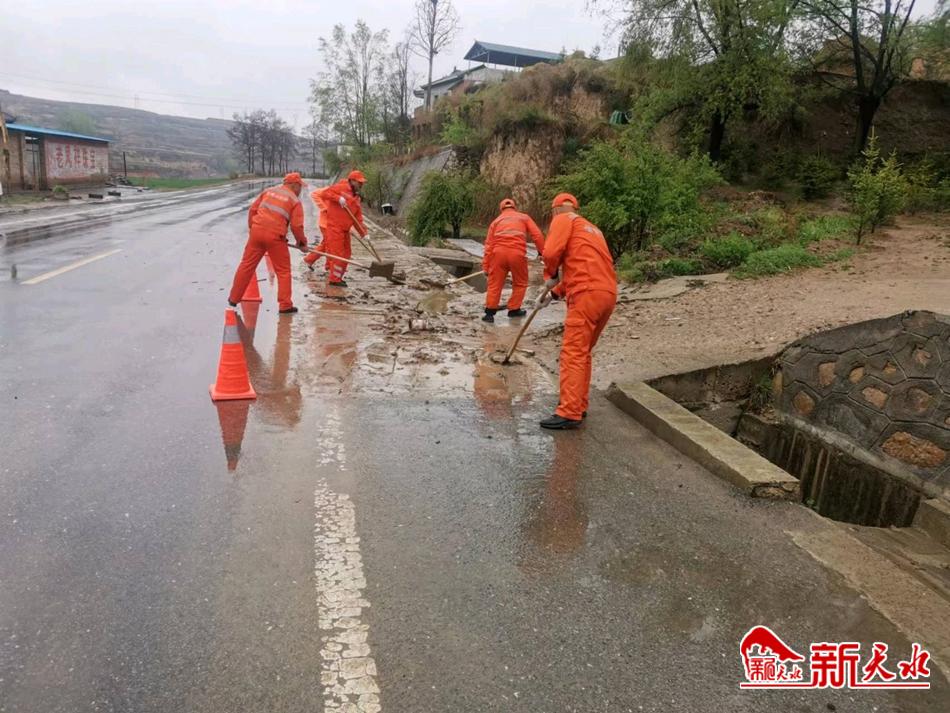 新天水讯 4月23日凌晨的强降雨,造成张家川境内的公路出现不同程度的水毁,张家川公路段积极行动,及时开展雨后公路养护,保障国省干线公路安全畅通。