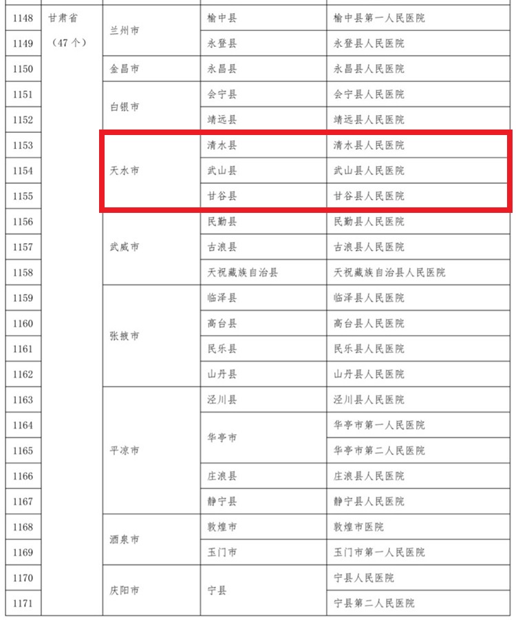 近日,国家卫生健康委办公厅印发了《“千县工程”县医院综合能力提升工作县医院名单》(简称《县医院名单》),甘肃47家县医院入选,其中天水市3家。