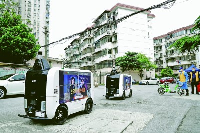 4月25日,无人快递车行驶在上海市杨浦区长海路街道浣纱小区内。为帮助解决该小区物资配送难题,上海理工大学菜鸟驿站安排了两台无人快递车进驻,将物资配送到居民家门口。新华社记者张建松摄