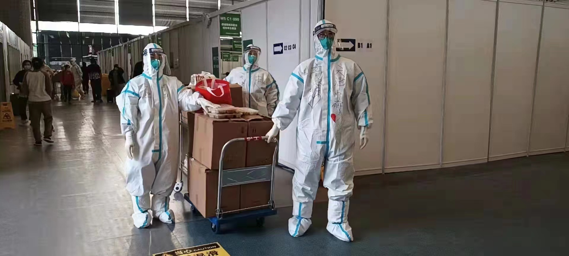 “盛满盒饭的保温箱重达50多斤,约2000份盒饭需要往返多次运送,穿着厚厚的防护服,往返运送几趟,就会汗流浃背。口罩湿了,糊在鼻子和嘴上,每喘一口气都很困难。护目镜里会流下汗水。眼前一片模糊,有时候搬运的路线全凭着记忆行走。”何心说,“政府为方舱内患者配发的营养餐非常丰盛,我们要尽快送达,让每个病人都能吃上热乎饭菜。”高杨也回忆道:“我记得W5舱首批408位康复者出舱当天,我们在顺利完成患者出舱工作后,天空下起了瓢泼大雨,而此时舱内患者的晚饭已经运送到舱外,为了不让饭菜淋湿,我和队友冒着大雨一趟一趟将几百份晚餐搬进舱内,让患者们及时吃上了热乎乎的饭菜。”
