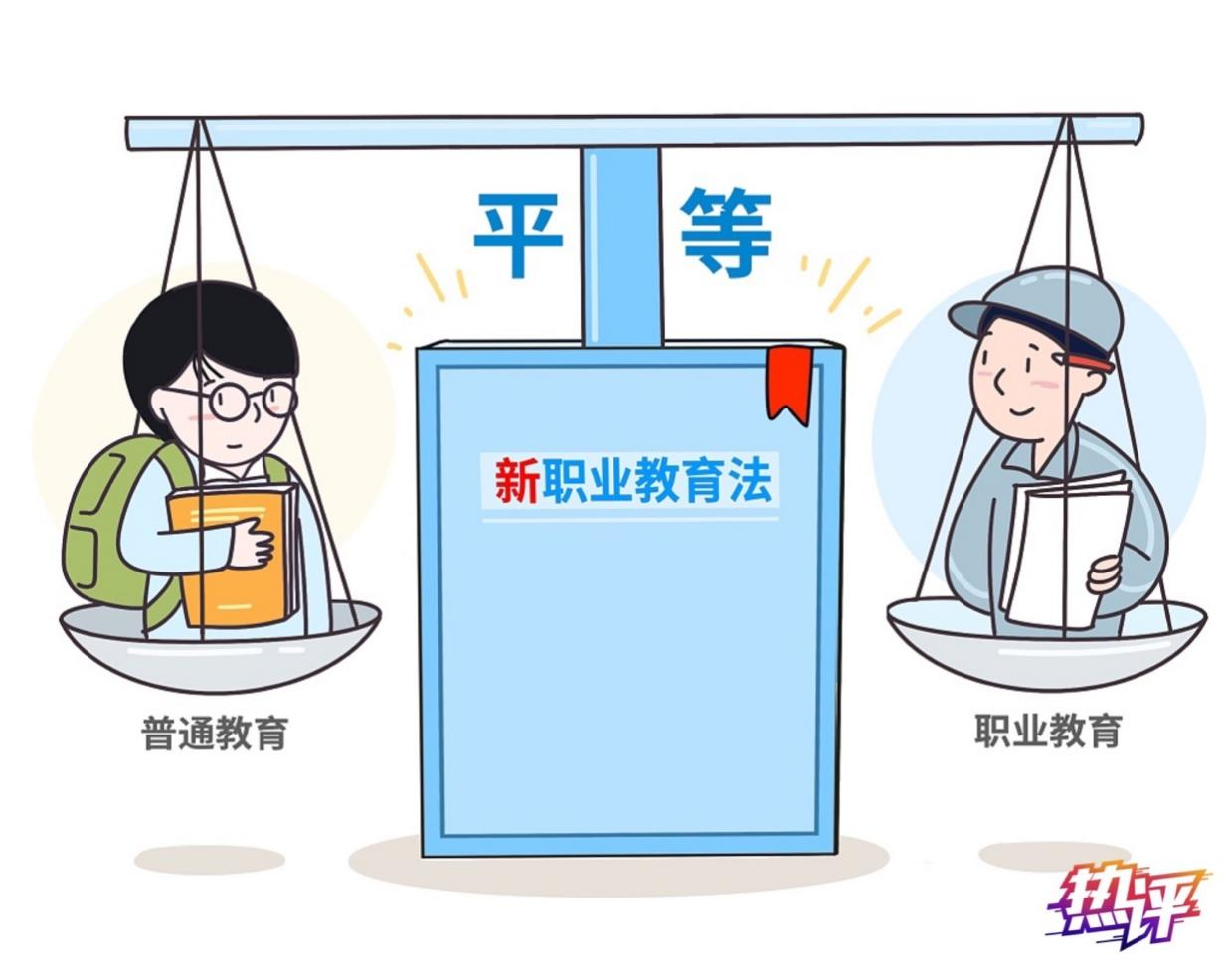 当前,我国已建成世界规模最大的职业教育体系,有1.13万所职业院校、超过3000万名在校生;“十三五”以来,在现代制造业、战略性新兴产业和现代服务业等领域,一线新增从业人员70%以上来自职业院校毕业生。职业教育的重要意义不言自明。但也要看到,一些人仍存“职业院校低人一等”的误区,一些地方存在重普通教育、轻职业教育的情况。对此,新修订的职业教育法强调“职业教育是与普通教育具有同等重要地位的教育类型”“职业学校学生在升学、就业、职业发展等方面与同层次普通学校学生享有平等机会”“提高技术技能人才的社会地位和待遇”,从类型定位到升学就业再到社会地位,都以法律形式予以明确。这不仅有利于引导全社会观念转变,也可以助力提升职业教育的吸引力,从而真正提升职业教育认可度。