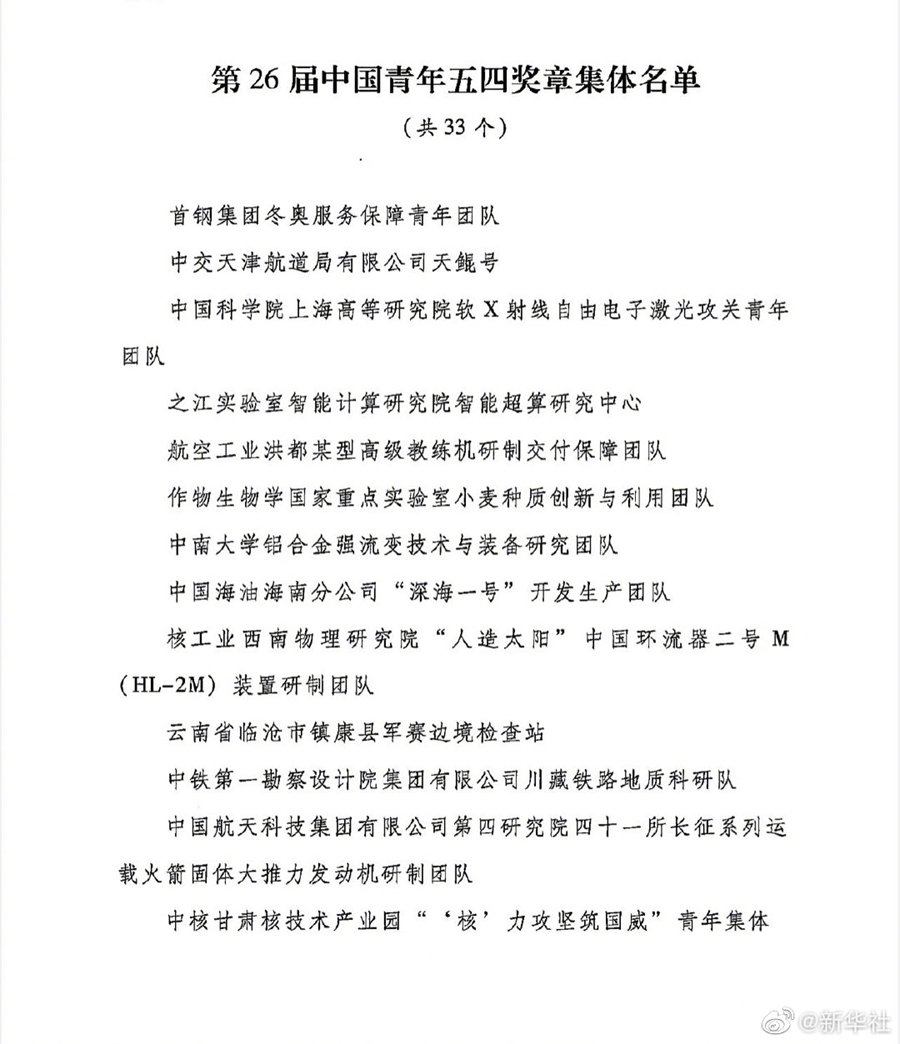 新华社北京5月3日电(记者黄玥)在建团百年到来之际,为充分发挥青年典型模范带头作用,激励广大青少年踔厉奋发、勇毅前进,以优异成绩喜迎党的二十大胜利召开,共青团中央、全国青联决定,授予马瑜婷等49名同志第26届中国青年五四奖章,授予首钢集团冬奥服务保障青年团队等16个青年集体第26届中国青年五四奖章集体。确认冯韶伟等73名同志获第26届中国青年五四奖章、中国航天科技集团有限公司第六研究院八〇一所载人航天推进系统部等17个青年集体获第26届中国青年五四奖章集体。