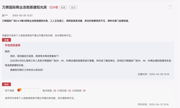 收到留言后,庆阳市自然资源局进行了第一次答复称,该局工作人员到万辉国际广场3#、4#、5#商业楼4层进行查看并约谈了建设单位,未发现违规搭建阳光房。