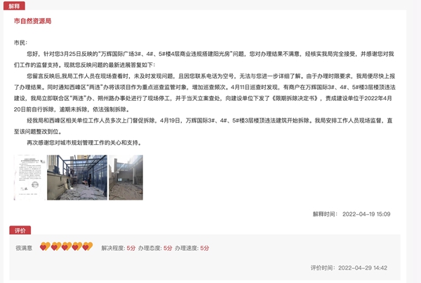 “经我局和西峰区相关单位工作人员多次上门督促拆除,4月19日,万辉国际3#、4#、5#楼3层楼顶违法建筑开始拆除。我局安排工作人员现场监督,直至该问题整改到位。”庆阳市自然资源局进行了回复。