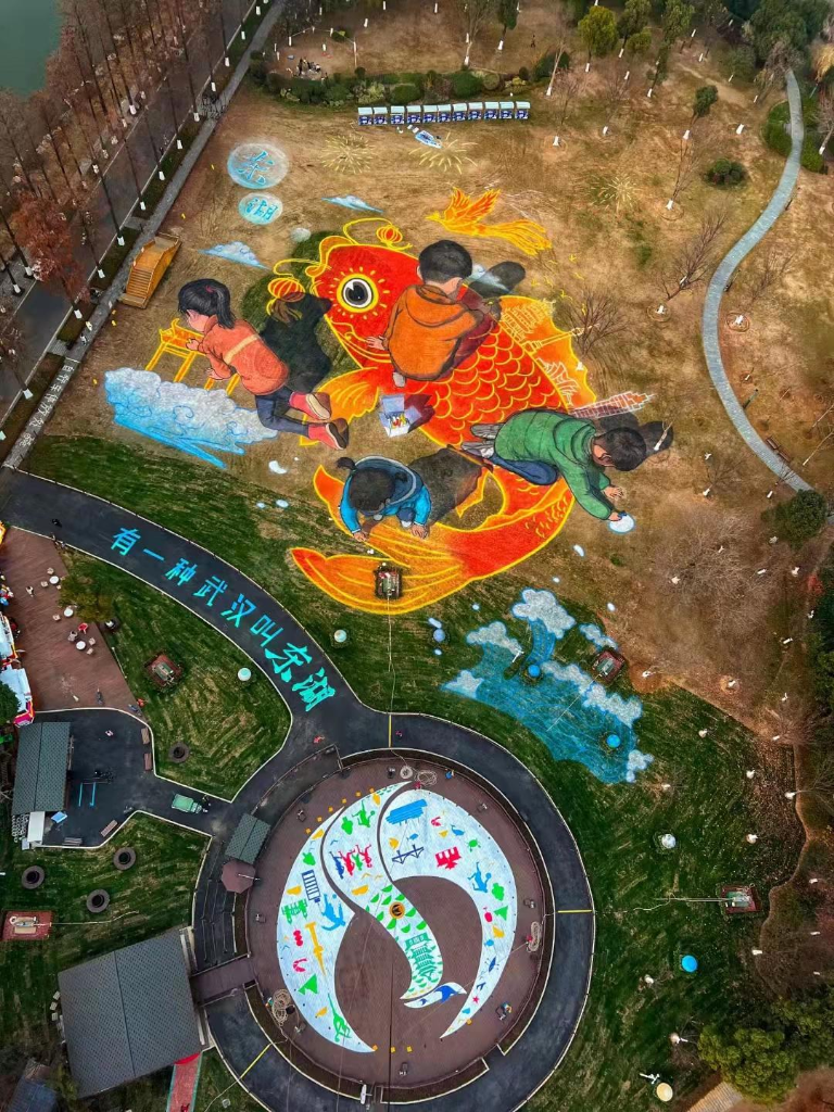 新华社武汉5月5日电(记者邓楠)五月初夏,在武汉市东湖风景区的草地上,一幅巨大的3D画栩栩如生。